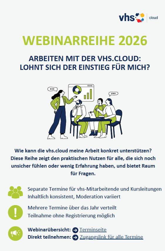 mit der Webinarreihe „Arbeiten mit der vhs.cloud: Lohnt sich der Einstieg für mich?“ möchten wir Kursleitungen, vhs-Mitarbeitende und vhs-Leitungen gezielt ansprechen, die noch wenig Erfahrung haben, unsicher sind oder die vhs.cloud bisher nicht genutzt haben.